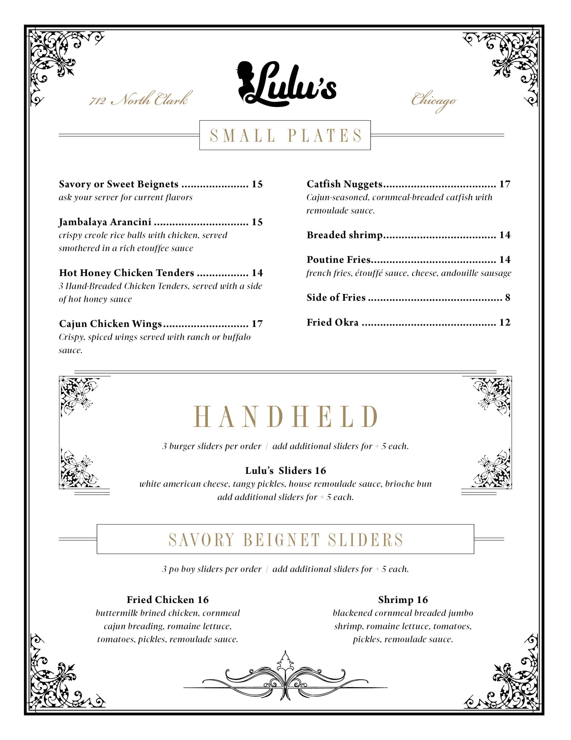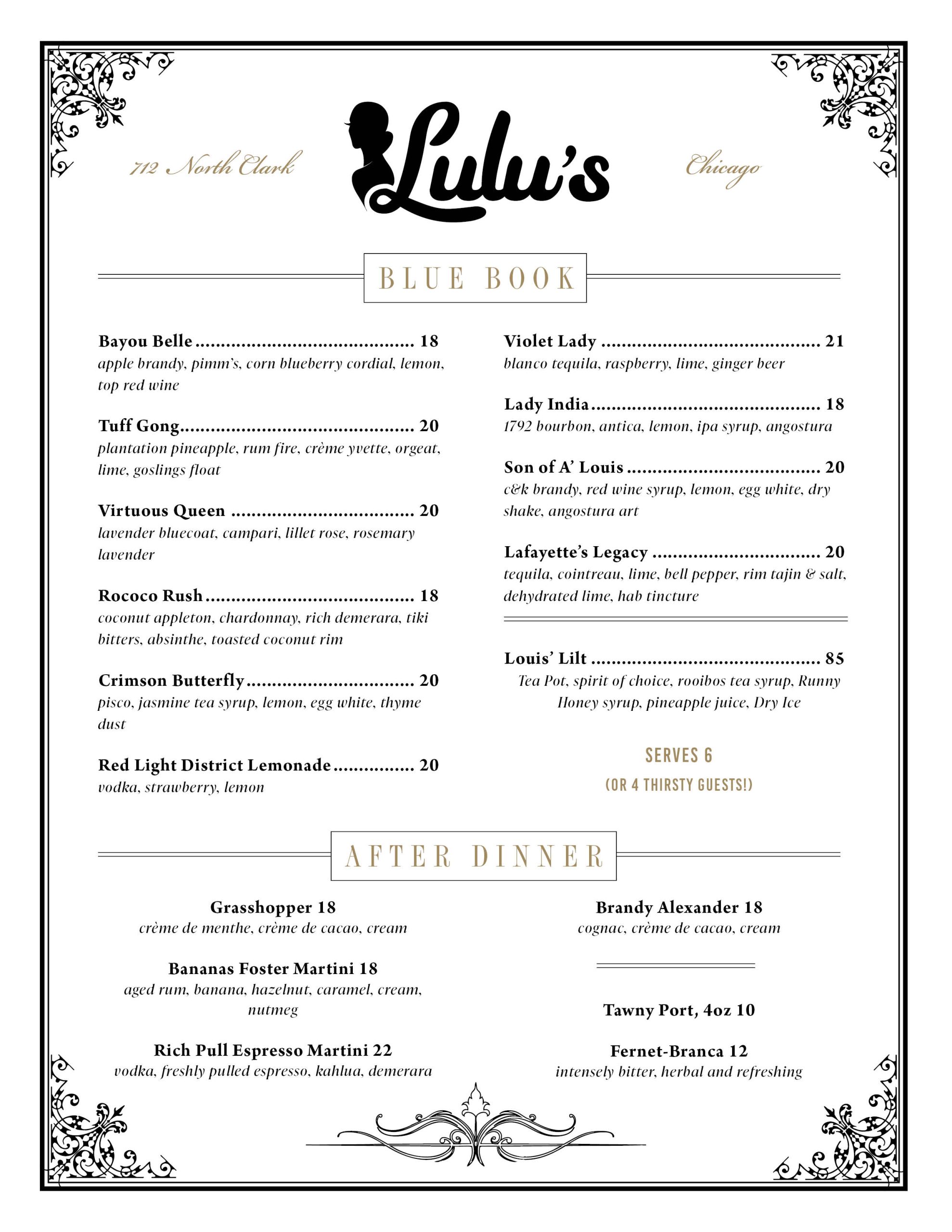 Lulu's Menu Dinner Cocktails Brunch Menu Dessert Happy Hour Late Night Menu Lulu’s Menu Dinner Cocktails Brunch Menu Dessert Happy Hour Late Night Menu Lulu’s Menu Only available at Lulu's, only open Thursday through Saturday